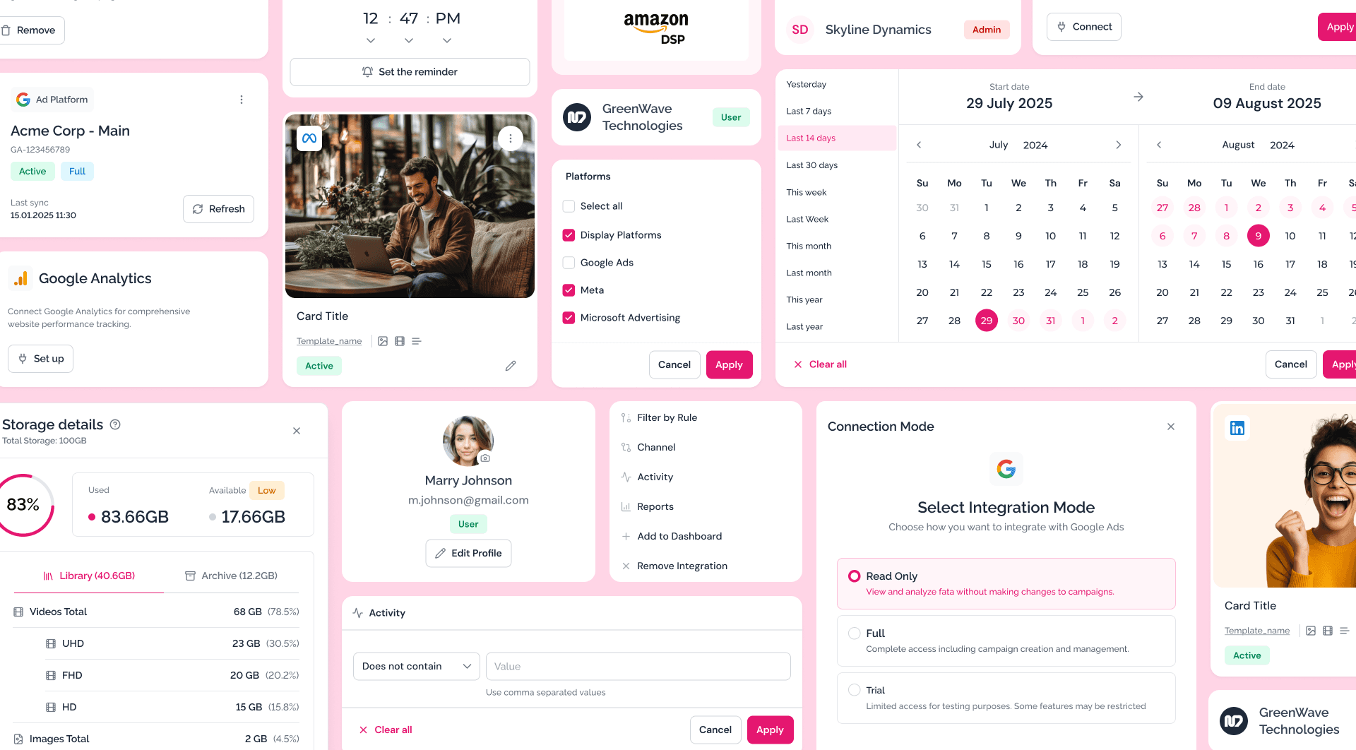 I built core features from the ground up, including complex Campaign Data Tables (designed for granular control, performance metric display, and bulk actions), custom Data Visualization Widgets, and the proprietary Integration Modals.